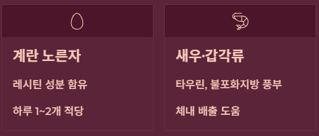 - 계란 노른자: 레시틴 성분이 들어있어 적당량(하루 1~2개)은 혈중 수치에 큰 영향을 주지 않는다는 연구가 많습니다.