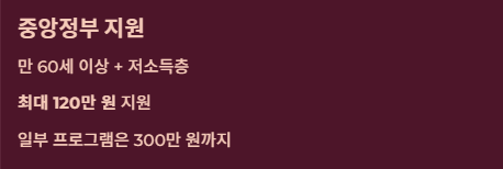 - 대상: 만 60세 이상 + 저소득층(기초생활수급자, 차상위계층, 한부모가족 등).