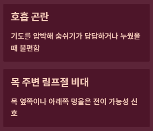 - 목 주변 림프절 비대: 목 옆쪽이나 아래쪽에 멍울이 잡힌다면 암이 주변 림프절로 전이되었을 가능성이 있습니다.