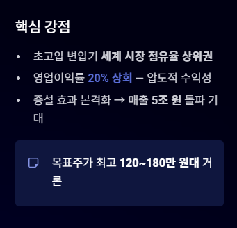 | HD현대일렉트릭 | 부동의 대장주. 초고압 변압기 세계 시장 점유율 상위권. 영업이익률이 20%를 상회하는 압도적 수익성. | 증설 효과 본격화로 매출 5조 원 돌파 기대. 목표주가 최고 120~180만 원대 거론. |