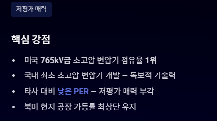 | 효성중공업 | 미국 765kV급 초고압 변압기 점유율 1위. 국내 최초 초고압 변압기 개발사로 기술력 독보적. | 타사 대비 낮은 PER(주가수익비율)로 저평가 매력 부각. 북미 현지 공장 가동률 최상단 유지. |