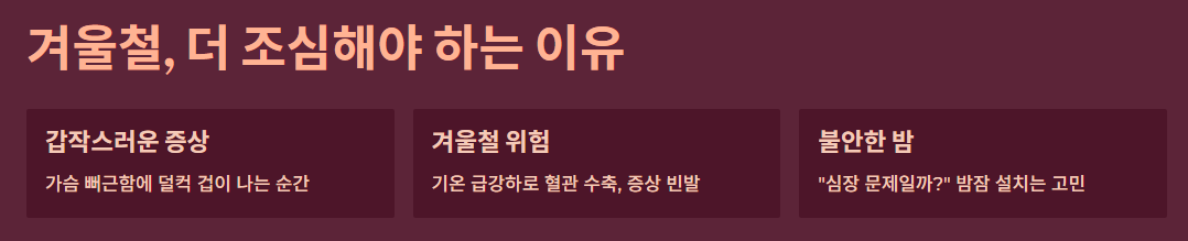 - 심장 질환: 짓누르는 통증, 식은땀 동반 시 즉시 응급실행.