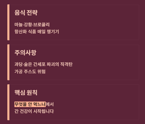 - 주의사항: 과당(과일 주스 포함)과 술은 간세포 파괴의 직격탄입니다.