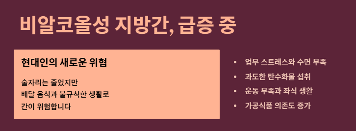 A: 이를 '비알코올성 지방간'이라고 합니다. 주로 과도한 탄수화물 섭취와 비만이 원인입니다. 2026년 현재 한국인 지방간 환자의 다수가 여기에 해당하니 식단 관리가 필수입니다.