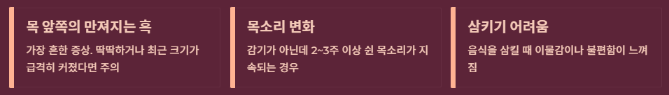 대부분은 통증이 없는 **'목의 혹'**으로 시작됩니다. 아래 증상 중 해당 사항이 있다면 정밀 검사를 고려해 보세요.