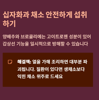 양배추나 브로콜리 같은 채소에는 갑상선 기능을 일시적으로 방해하는 성분(고이트로젠)이 들어있을 수 있지만, 열을 가해 조리하면 대부분 파괴됩니다. 따라서 질환이 있다면 생채소보다는 익힌 채소 위주로 드시는 것이 안전합니다.
