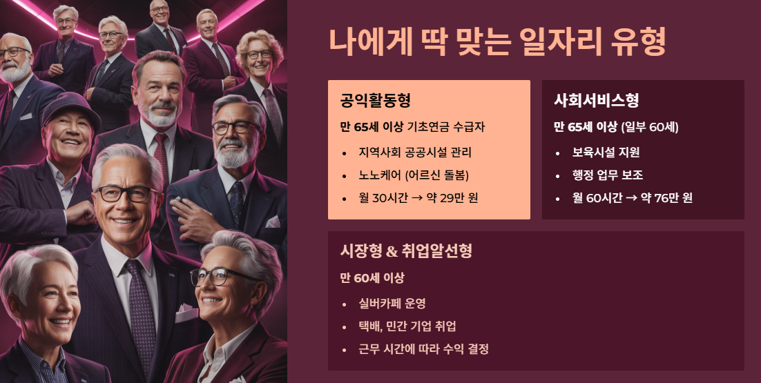 - 시장형 & 취업알선형 (수익 중심): 만 60세 이상이면 가능합니다. 실버카페 운영, 택배, 혹은 민간 기업 취업을 연결해 주며 근무 시간에 따라 수익이 결정됩니다.