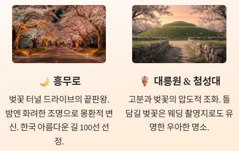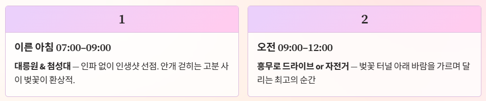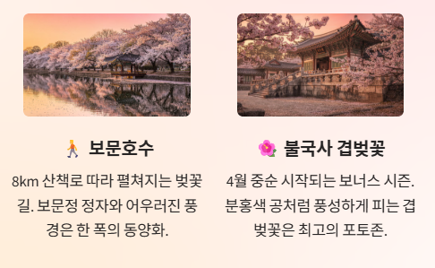 2. 명소: 흥무로(터널), 대릉원(고분뷰), 보문호수(산책), 불국사(겹벚꽃).