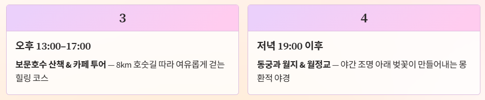 • 오후(13:00~17:00): 보문호수 산책 및 카페 투어.