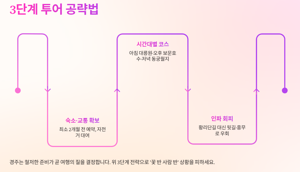경주는 도시 전체가 박물관이자 벚꽃길입니다. 효율적인 이동을 위해 3단계 전략을 세워보세요.