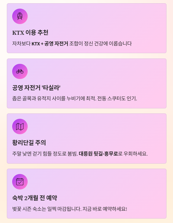 경주 벚꽃 시즌의 숙박 예약은 최소 2개월 전에는 끝내야 합니다. 또한, 시내 교통 정체가 매우 심하므로 공영 자전거 '타실라'나 전동 스쿠터 대여를 적극 고려하세요. 좁은 골목과 유적지 사이를 누비기에 최적입니다.