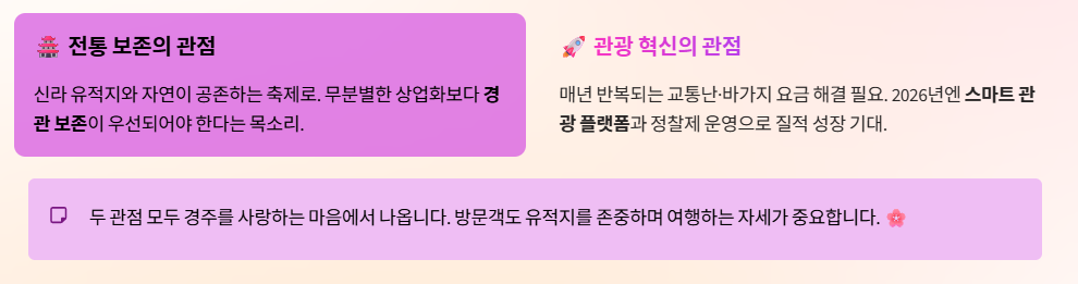 경주의 벚꽃은 신라의 유적지와 어우러질 때 가치가 극대화됩니다. 무분별한 상업 시설 확충보다는 유적지의 경관을 해치지 않는 선에서 자연과 역사가 공존하는 축제가 되어야 한다는 목소리가 높습니다.