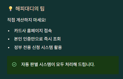 💡 해피대디의 Tip: 정확한 본인의 대상 여부는 신청 기간 중 카드사 홈페이지나 정부의 전용 신청 시스템에서 본인 인증만으로 즉시 조회가 가능합니다. 복잡한 계산기보다 시스템 내 자동 판별 기능을 활용하세요!