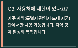 A. 네, 거주 중인 특별시, 광역시, 또는 도내 시·군 안에서만 사용이 가능합니다. 지역 경제 활성화를 위한 목적이 크기 때문입니다.