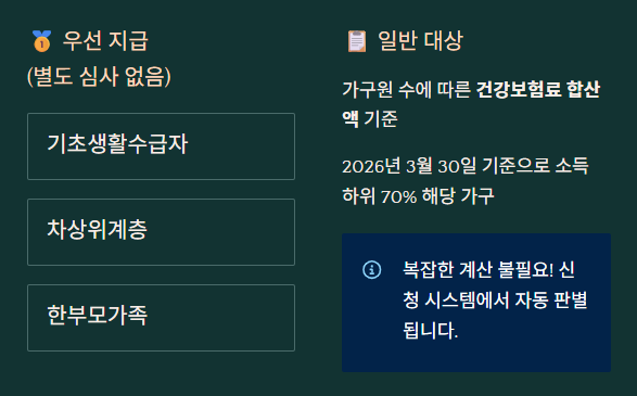 - 우선 지원 대상: 기초생활수급자, 차상위계층, 한부모가족은 별도의 복잡한 판별 없이 우선 지급됩니다.