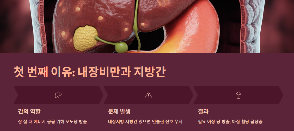 - 결과: 필요 이상으로 간에서 당을 뿜어내어 아침 혈당이 치솟습니다.