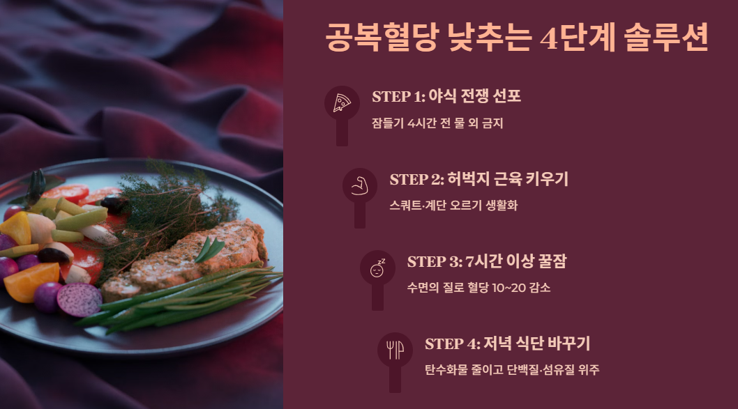 - 저녁에 탄수화물(밥, 면, 빵)을 줄이고, 단백질과 섬유질(채소) 위주로 드세요. 혈당 스파이크를 막아 밤사이 혈당이 안정적으로 유지됩니다.