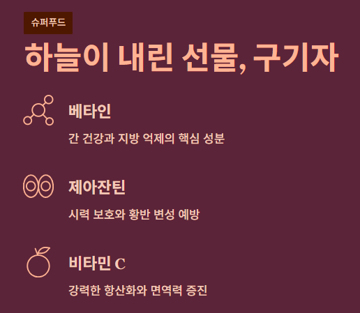 구기자는 예로부터 '하늘이 내린 선물'이라 불리며 약재로 널리 쓰였습니다. 현대 과학에서도 그 가치가 입증되고 있는데, 특히 베타인, 제아잔틴, 비타민 C 등이 풍부하여 노화 방지와 면역력 강화에 탁월한 효과를 보입니다.