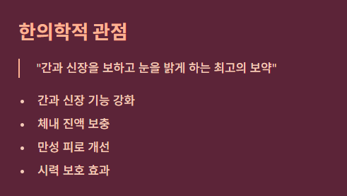 | 핵심 효능 | 간 건강 개선, 시력 보호, 항노화, 면역력 증진 |