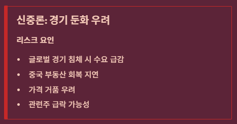 구리는 산업 금속이기에 글로벌 경기 침체가 오면 수요가 급감할 수 있습니다. 특히 중국의 부동산 경기 회복세가 더딜 경우, 가격 거품이 빠지며 관련주가 급락할 위험이 있다는 지적도 존재합니다.