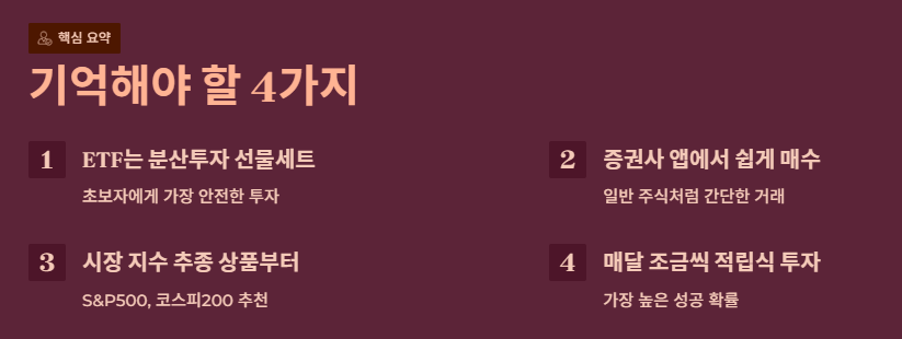 - ETF는 여러 종목을 묶은 종합 선물 세트로 초보에게 안전합니다.