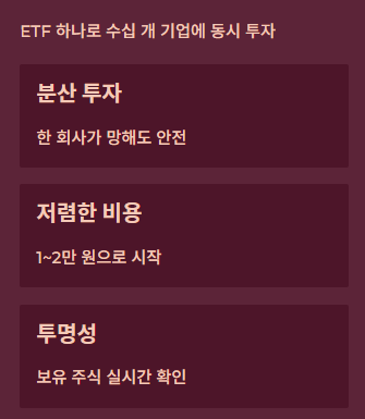 - 장점 2: 저렴한 비용 - 개별 주식을 다 사려면 수천만 원이 들지만, ETF는 1~2만 원으로도 시작할 수 있습니다.