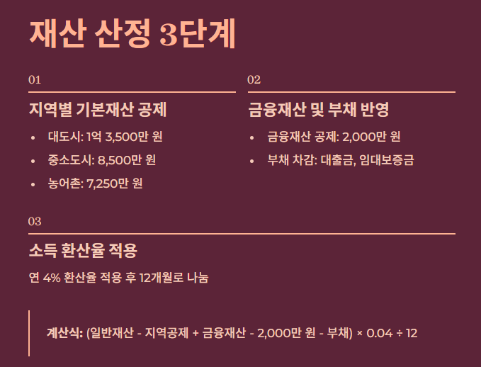 계산식: (일반재산 - 지역공제 + 금융재산 - 2,000만 원 - 부채) × 0.04 ÷ 12