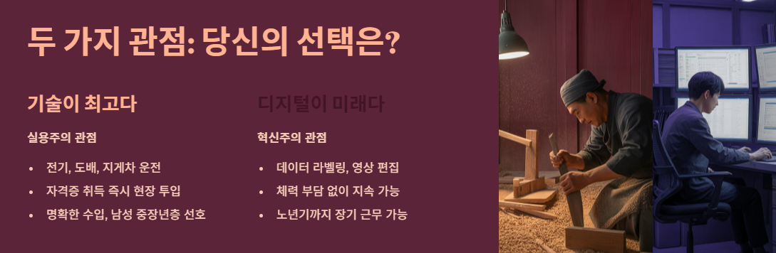 - "기술이 최고다" (실용주의 관점): 전기, 도배, 지게차 운전처럼 몸으로 익히는 기술은 배신하지 않는다는 시각입니다. 자격증 취득 즉시 현장에 투입될 수 있고 수입이 비교적 명확하여 남성 중장년층이 선호합니다.