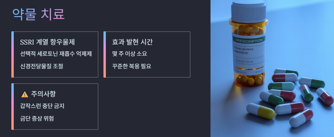 - 주로 **선택적 세로토닌 재흡수 억제제(SSRI)** 계열의 항우울제가 처방됩니다.