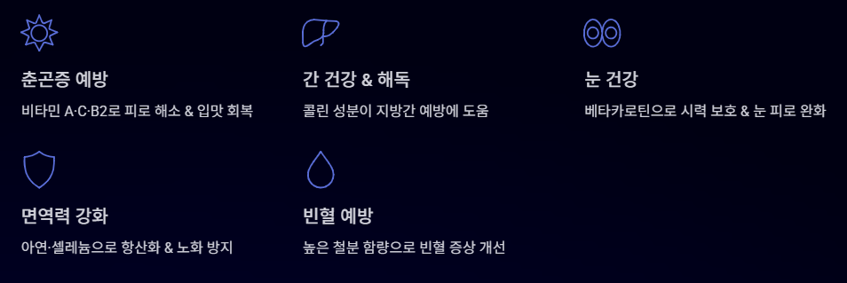 - 간 건강 및 해독: '콜린' 성분이 풍부해 간세포에 지방이 쌓이는 것을 억제하고 지방간 예방에 도움을 줍니다.