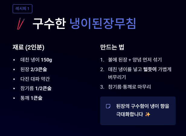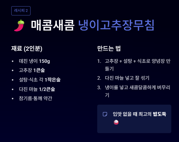 - 방법: 고추장 베이스의 양념장에 식초와 설탕을 넣어 새콤달콤하게 무칩니다. 입맛이 없을 때 최고의 밥도둑입니다.