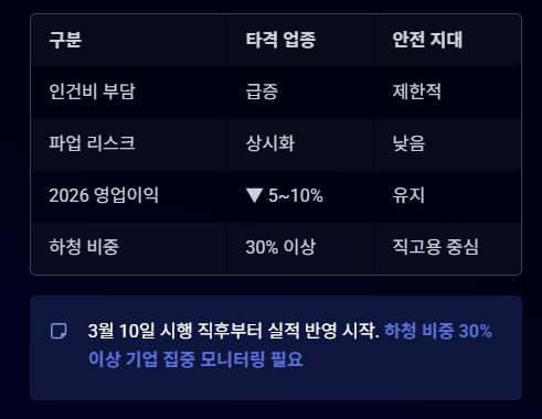 | 인건비 부담 | 급증 예상 (다단계 하청 구조) | 제한적 (직고용 비중 높음) | 하청 비중 30% 이상 기업 주의 |