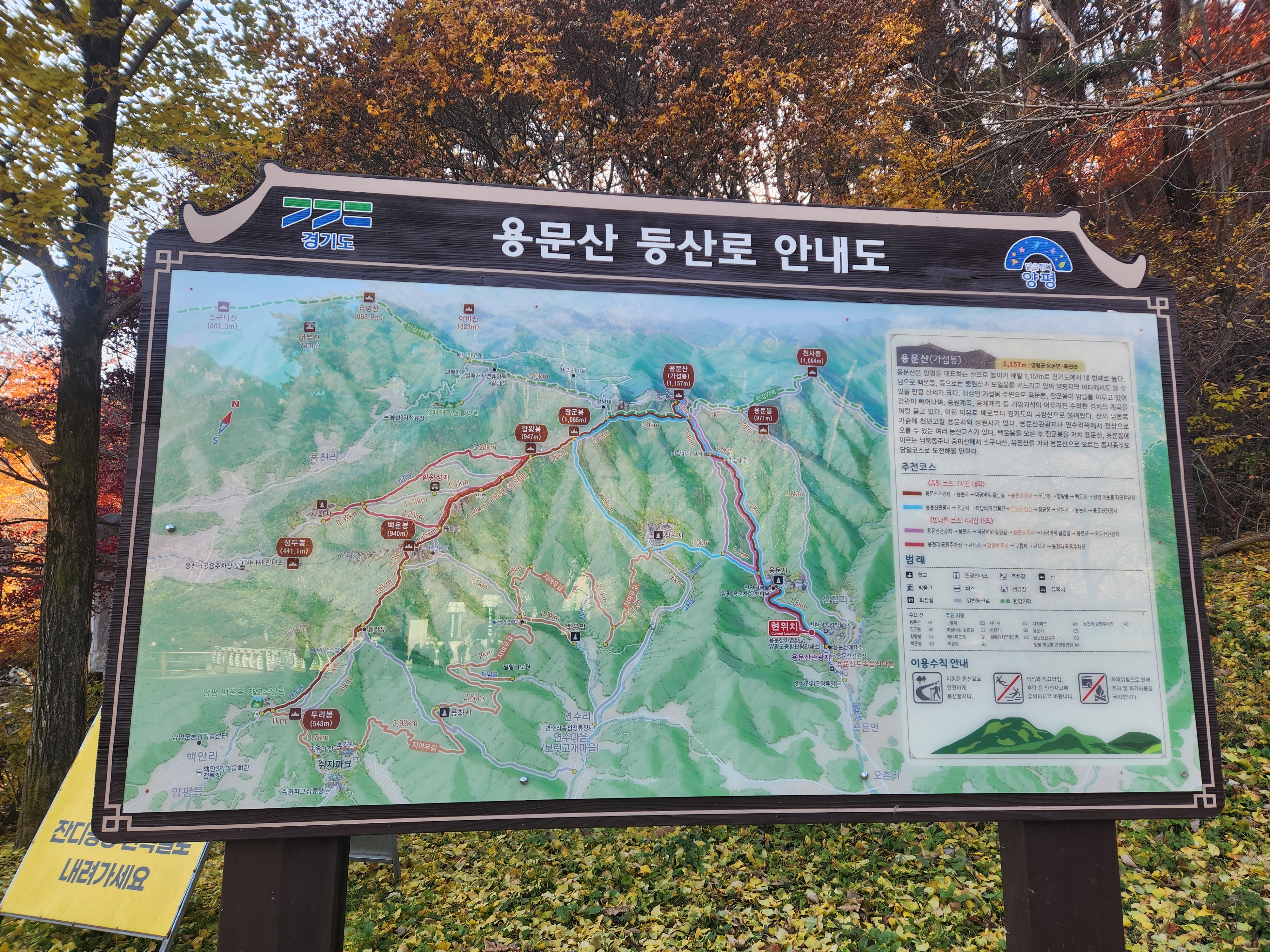 가을이 다 가기 전, 붉은 단풍과 노란 은행잎이 어우러진 양평 용문사로의 나들이 어떠신가요? 단, 주말에 가신다면 마음의 여유(와 간식)를 챙기시고, 교통 체증은 조금 각오하고 가시는 게 좋겠습니다. ^^