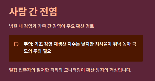 가장 무서운 단계입니다. 감염된 환자의 침, 혈액, 소변 등 체액을 통해 밀접 접촉자에게 전파됩니다. 특히 병원 내 감염이나 가족 간 감염이 주요 확산 경로로 꼽히며, 기초 감염 재생산 지수값은 낮지만 치사율이 워낙 높아 극도의 주의가 필요합니다.