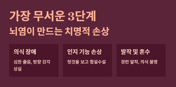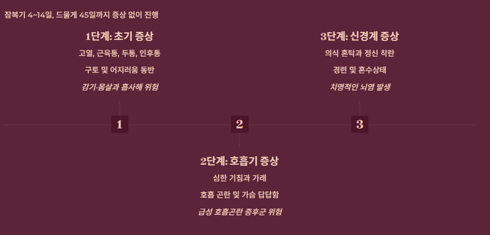 - 악화: 호흡기 장애를 거쳐 치명적인 뇌염으로 진행됩니다.