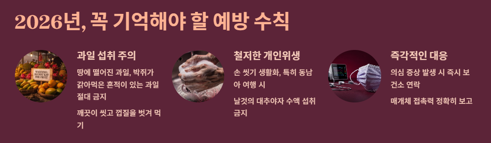 바이러스는 어디서든 나타날 수 있습니다. 2026년의 기후 위기는 과일박쥐의 서식지를 인간 거주지로 옮겨놓고 있죠. 따라서 떨어진 과일을 함부로 먹지 않고, 손 씻기 등 개인위생을 철저히 하며 면역력을 평소에 관리하는 것이 실질적인 생존 전략이라는 관점입니다.