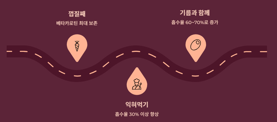 베타카로틴은 지용성 비타민입니다. 올리브유나 견과류와 함께 볶거나 드레싱을 곁들이면 흡수율이 60~70% 이상으로 극대화됩니다.