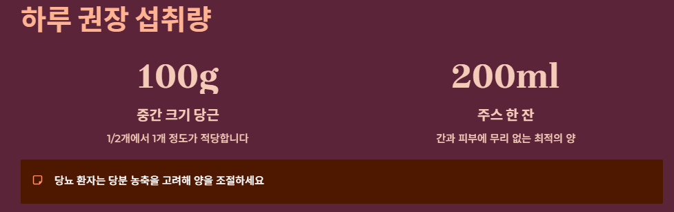무게로 치면 약 50~100g 내외가 적당하며, 주스로 마실 경우 종이컵 한 잔 분량이 간과 피부에 무리를 주지 않는 최적의 양입니다.