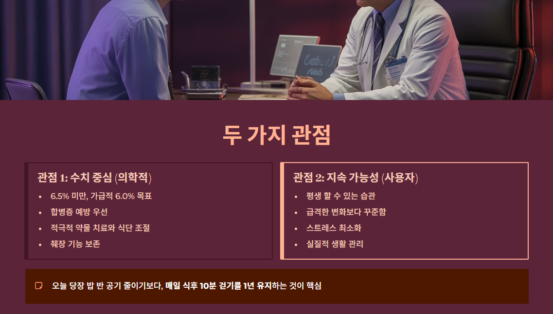 - 반면, 많은 환자분은 급격한 식단 변화에 스트레스를 받아 중도 포기하곤 합니다. 따라서 "평생 할 수 있는 습관"을 만드는 것이 더 중요하다고 봅니다. 오늘 당장 밥을 반 공기 줄이는 것보다, 매일 식후 10분 걷기를 1년 내내 유지하는 것이 당화혈색소를 낮게 유지하는 실질적인 비결이 됩니다.