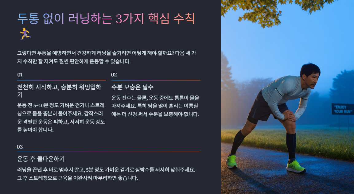 러닝은 건강한 삶을 위한 정말 좋은 습관이지만, 몸에 무리를 주면서까지 할 필요는 없습니다. 오늘 알려드린 내용을 참고해서 자신의 몸 상태에 맞춰 운동 강도를 조절하는 것이 중요해요. 혹시 러닝을 하다가 몸에 이상 신호가 느껴진다면, 잠시 멈추고 쉬어주는 용기도 필요합니다. 건강한 운동 습관이 여러분의 삶을 더욱 활기차게 만들어 줄 거예요!