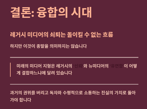 결론적으로 레거시 미디어의 쇠퇴는 돌이킬 수 없는 흐름입니다. 하지만 이것이 기성 언론의 종말을 의미하지는 않습니다. 미래의 미디어 지형은 레거시 미디어의 **'신뢰'**와 뉴미디어의 **'유연함'**이 어떻게 결합하느냐에 따라 결정될 것입니다. 다시 살아남기 위해선 과거의 권위를 버리고 독자와 수평적으로 소통하는 '진실'의 가치로 돌아가야 합니다.