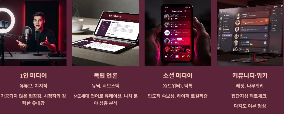 | 독립 언론/뉴스레터 | 뉴닉, 서브스택 | MZ세대의 언어로 뉴스 큐레이션, 니치(Niche) 분야 심층 분석 |