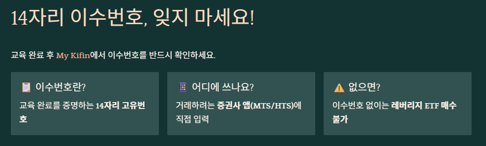 5. 수료증 및 이수번호 확인: 교육 완료 후 'My Kifin' 메뉴에서 14자리 이수번호를 확인합니다. 이 번호가 있어야 증권사에 등록이 가능합니다.