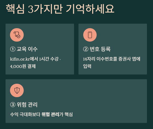 3. 한 번 등록해두면 추가로 교육을 듣지 않아도 되지만, 신규 계좌를 개설할 경우 해당 증권사에 다시 등록해야 한다.