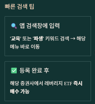 • 공통 경로: 대부분의 증권사 앱에서 [메뉴] → [고객센터] → [신청/변경] → [파생 ETF/ETN 거래신청] → [교육이수 정보등록] 순서로 찾을 수 있습니다.
