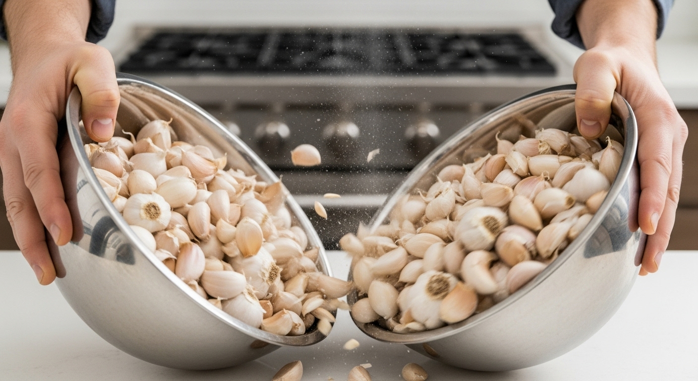 - 두 개의 스텐볼/용기 활용: 통마늘을 분리한 후 마늘 알맹이를 두 개의 크고 단단한 스텐볼 사이에 넣고 볼 입구를 딱 맞게 포갠 뒤, 힘껏 흔들어줍니다. 약 30초~1분 정도 흔들면 껍질이 분리됩니다. 깨지지 않도록 너무 세게 하진 마세요.