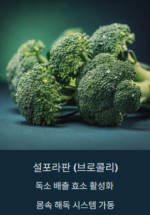 - 설포라판(브로콜리): 몸속 독소를 배출하는 효소를 활성화합니다.
