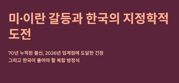 미국과 이란의 갈등은 단순한 두 나라 사이의 분쟁을 넘어, 지난 70여 년간 누적된 정치, 경제, 종교적 이해관계가 얽힌 복합적인 지정학적 서사입니다. 2026년 현재, 양국의 긴장은 임계점에 도달해 있으며, 이는 동북아시아의 핵심 국가인 한국에도 중대한 도전 과제를 던지고 있습니다.
