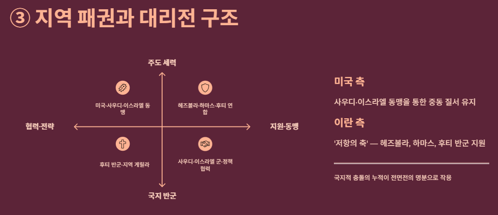 미국은 사우디아라비아, 이스라엘과 같은 동맹국을 통해 중동의 질서를 유지하려 합니다. 반면 이란은 '저항의 축(Axis of Resistance)'이라 불리는 헤즈볼라, 하마스, 후티 반군 등을 지원하며 영향력을 확대해 왔습니다. 이 과정에서 발생하는 국지적 충돌이 누적되어 전면전의 명분으로 작용하고 있습니다.