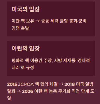 미국은 이란의 핵 보유가 중동 내 세력 균형을 무너뜨리고 핵 군비 경쟁을 촉발할 것이라 우려합니다. 반면, 이란은 평화적 목적의 핵 이용권을 주장하며 서방의 제재를 '경제적 테러'로 규정합니다. 2015년 핵 합의(JCPOA)가 2018년 미국의 탈퇴로 파기된 이후, 2026년 현재 이란의 핵 농축 수준이 무기화 직전 단계에 도달한 것이 현 군사 충돌의 직접적인 도화선이 되었습니다.